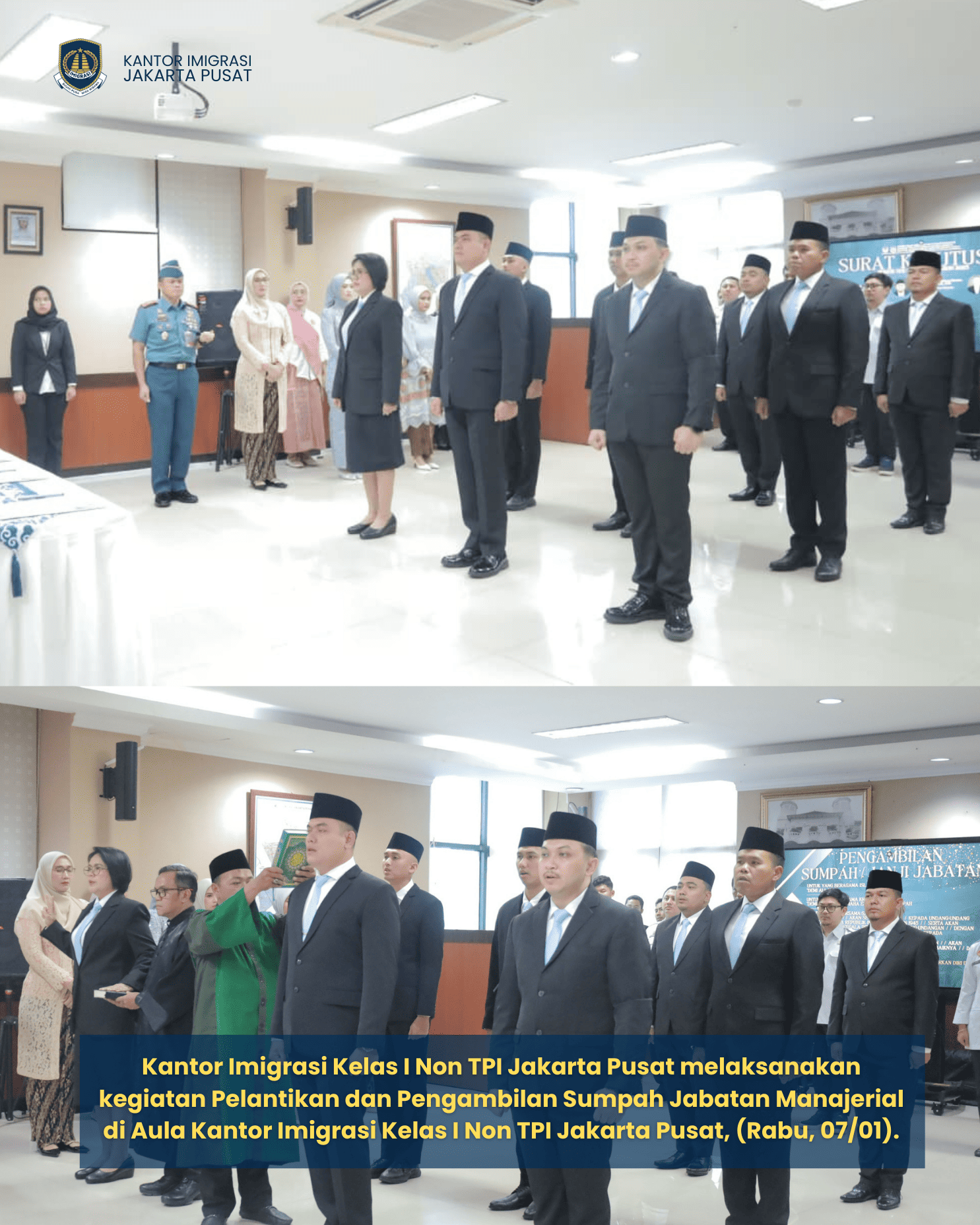 [23:53, 07/01/2026] Bosku👨‍💼 Pratama: Jakarta, 7 Januari 2025 — Kantor Imigrasi Kelas I Khusus Non TPI Jakarta Pusat melaksanakan kegiatan Pelantikan dan Pengambilan Sumpah/Janji Jabatan Manajerial terhadap 9 (sembilan) orang pejabat, yang berlangsung di Aula Kantor Imigrasi Kelas I Non TPI Jakarta Pusat.